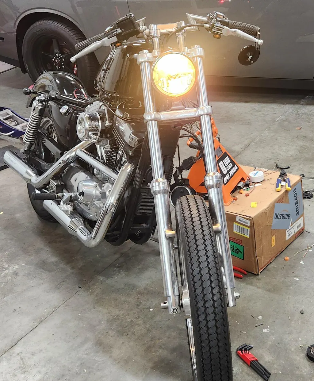 Nice alternative to the mounts that top mount using the original "eyebrow" mounting holes. It's nice that piece the headlight actually attaches to bolts on separately. There's otherwise not much room to get behind the mounting bolt to tighten it as it's pretty close to the frame.